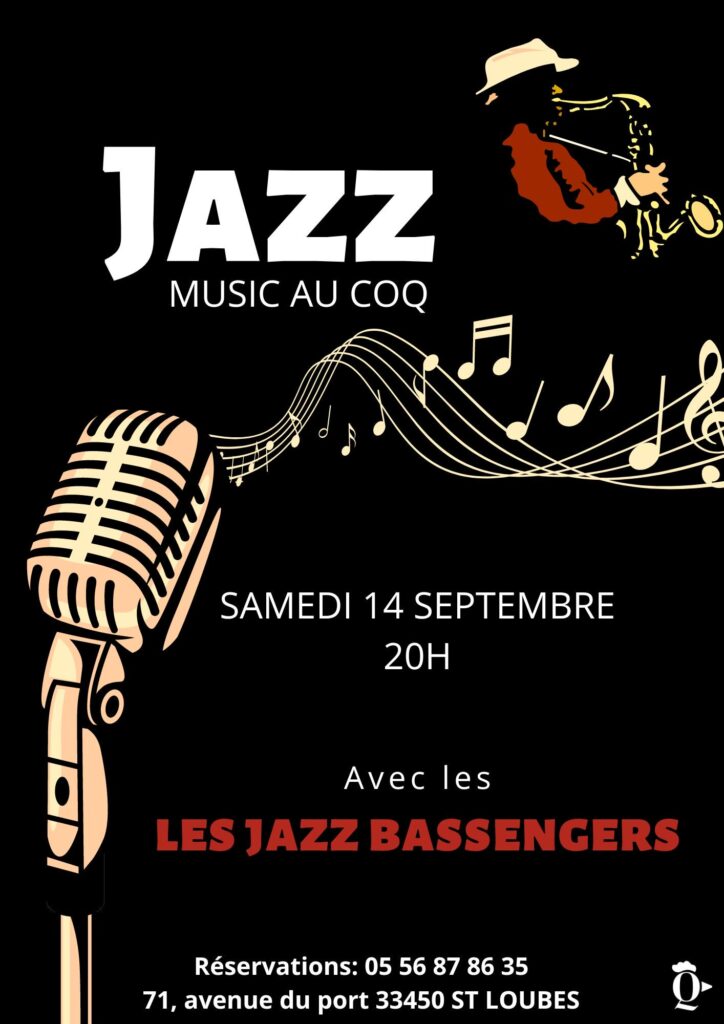Les amateurs de jazz et de bonne cuisine se donneront rendez-vous le samedi 14 septembre au Coq Sauvage pour une soirée musicale inoubliable. Dès 20h, laissez-vous transporter par les Jazz Bassengers, un groupe talentueux qui vous fera vibrer au rythme du jazz. Profitez de cette ambiance chaleureuse et raffinée tout en dégustant nos plats savoureux. C’est l’occasion idéale pour passer une soirée conviviale, bercée par les mélodies intemporelles du jazz.